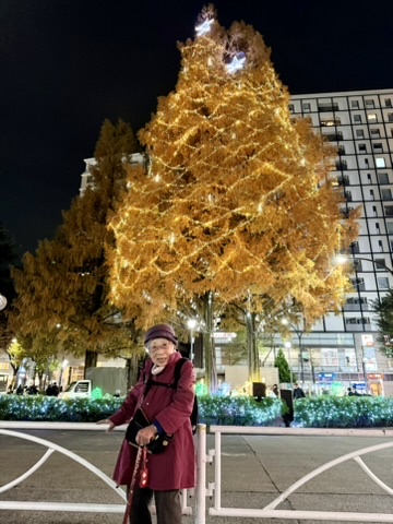 母と見る、初めてのクリスマスツリーの点灯。母はタクシーで帰りたがったけれど、なかなかやってこない。バスだとここから乗り換えになる。私は運動不足にならないように、バスの乗り換えの停留所まで早歩きで行くことにする。列に並んでいた女性が、「お先にどうぞ」と譲ってくれる。