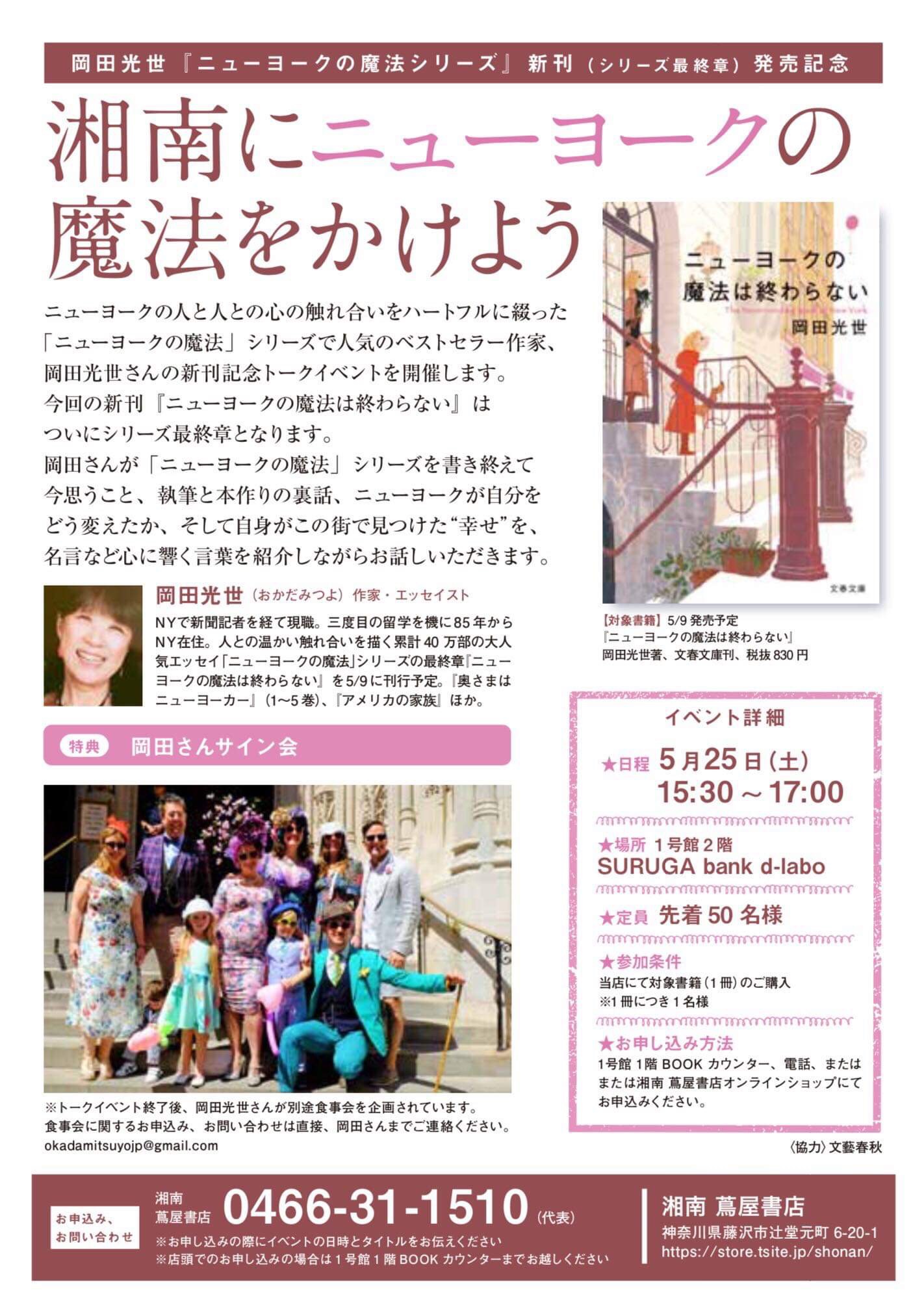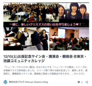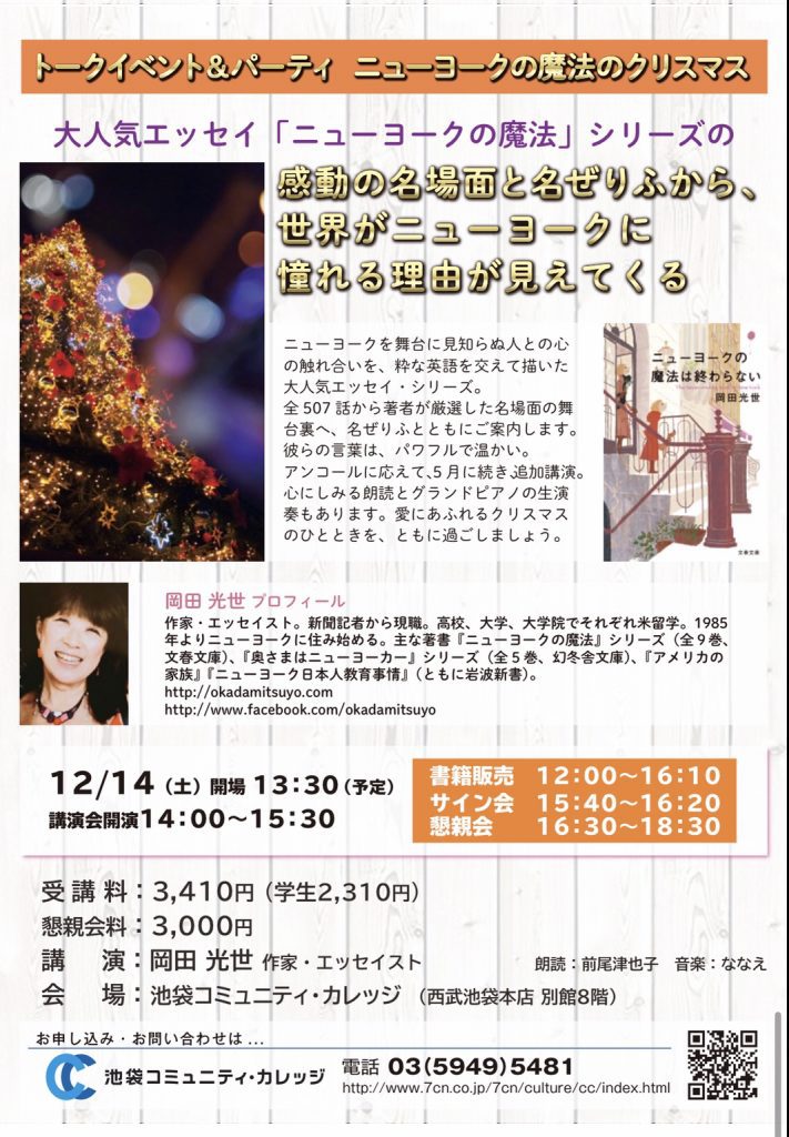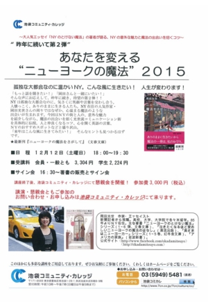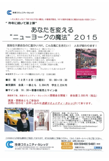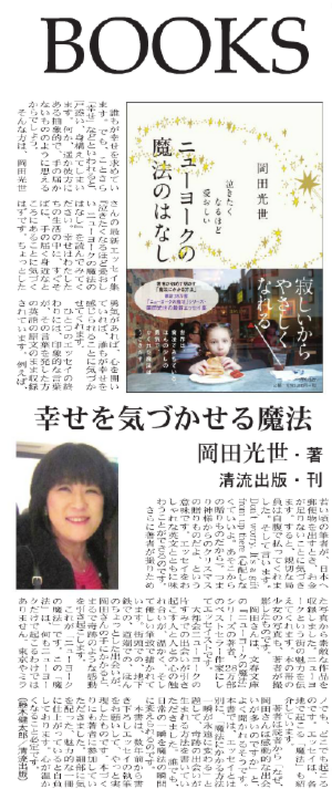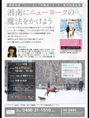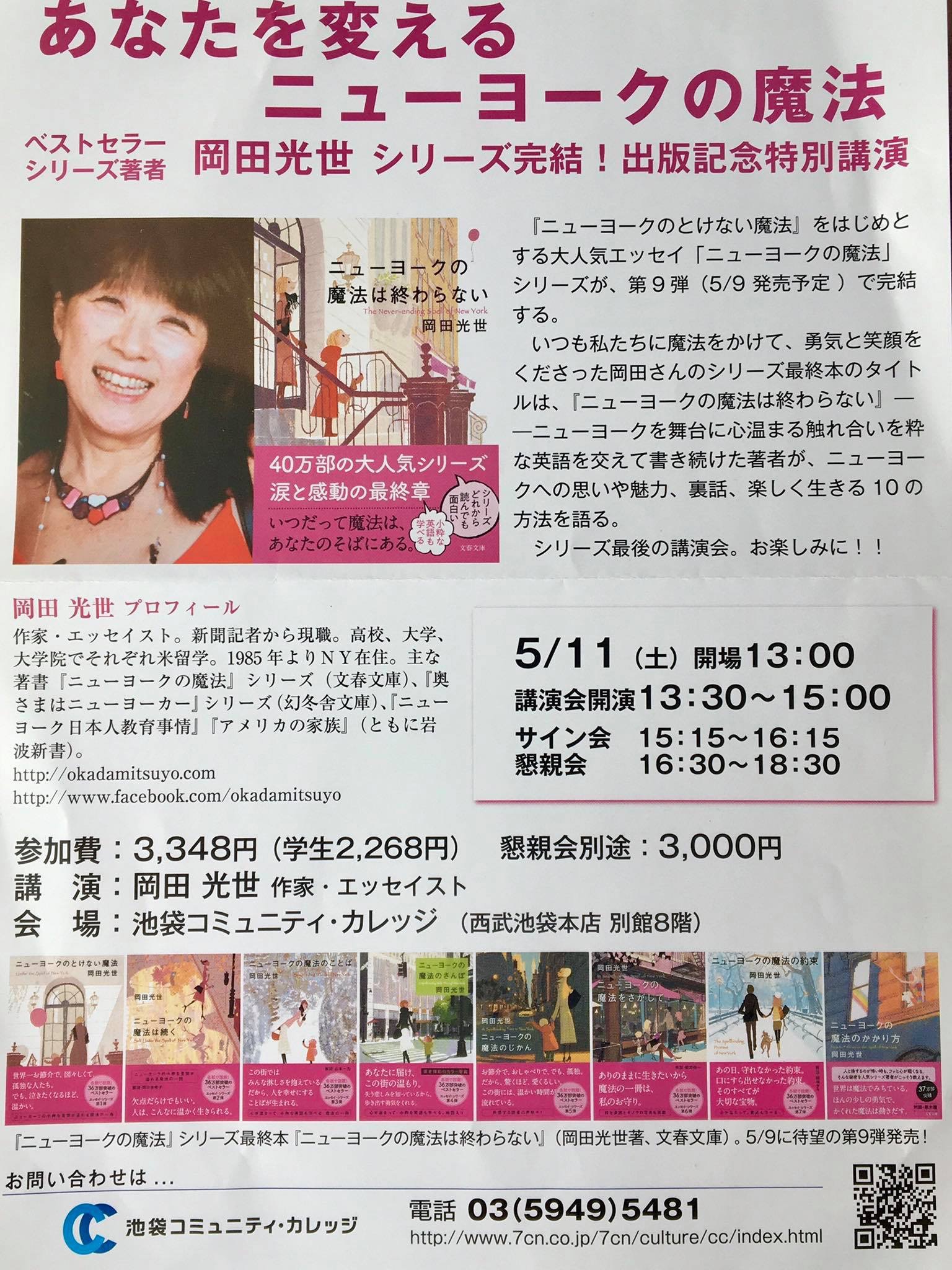 新刊刊行記念講演会 各紙で話題の本「ニューヨークの魔法」シリーズ の岡田光世が贈る あなたを変える”ニューヨークの魔法” ~孤独な大都会なのに温かいNY。こんなふうに生きたい~ あなたの人生が変わります!