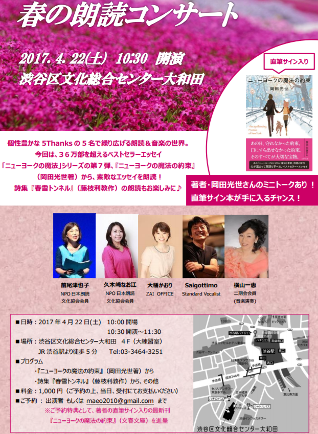 ちなみに、私のFBの投稿でご存じの方も多い、べらんめえの江戸っ子・鯨井クン、前に「ニューヨークの魔法のじかん」の、そして今は私のウェブサイトをボランティアで作ってくれている山本クン、夜の新宿のピアノバーで対談し、「ニューヨークの魔法のじかん」の楽しいビデオを作ってくれた岩井氏、「ニューヨークのとけない魔法」のシリーズなどでいい味出してる最愛の(?)夫も親睦会に参加します。