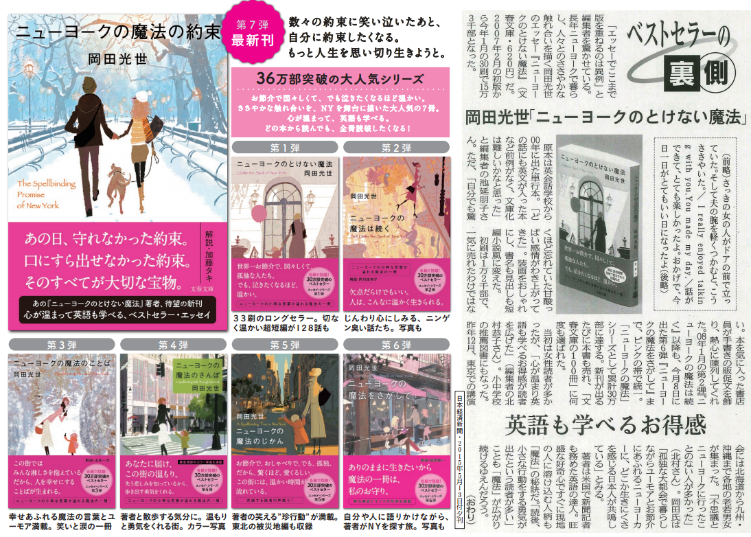 お陰様で27万5千部突破の「ニューヨークの魔法」シリーズ(文春文庫)、またまた重版がかかりました! 第4弾『ニューヨークの魔法のさんぽ』。私が撮影したNYのカラー写真入りです。