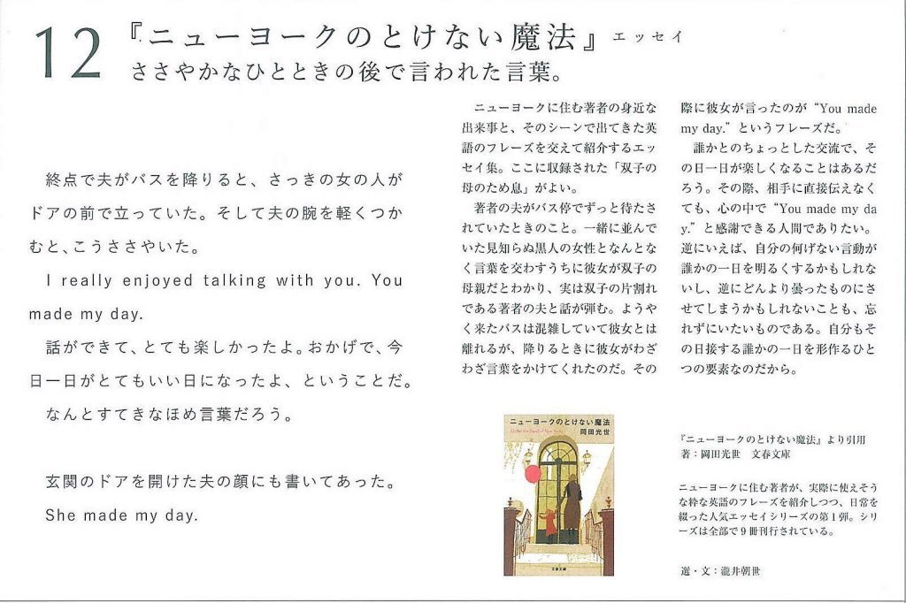岡田光世が語るニューヨークの人々との心の触れ合いのエピソードには、そんな魔力が潜んでいます。幸せの見つけ方。自分に素直になり、一歩踏み出す勇気。気持ちよく生きる術。楽しく豊かな暮らし。心が癒される英語のフレーズ。来年はちょっと違う年に、と思っているあなた自身への、最高のクリスマスプレゼントになるかもしれません。